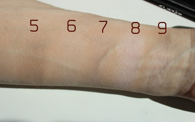 Пятый оттенок - это беж, немного уходящий в серо-коричневый.Мне напоминает латте. На солнце более бежевый. Практически нейтральный. Его особенность (как и следующих двух оттенков) заключается в том, что он практически незаметен на коже. Такие оттенки неплохо "пускать" под стрелку или просто для выравнивания тона, перекрытия каких-то мелких недостатков. Также может работать "ластиком" исправляя какие-то огрехи.